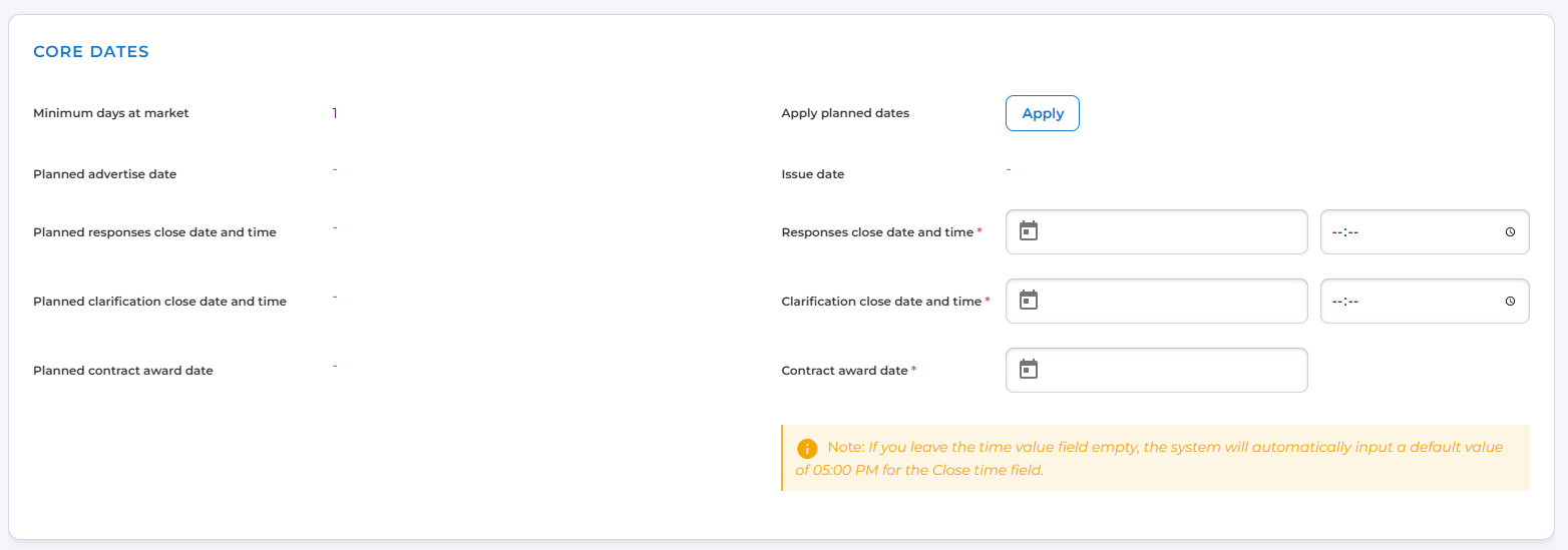 Below this, there is a Core dates section for the activity. These are firm dates rather than estimates, will be visible to the suppliers and therefore must be adhered to.