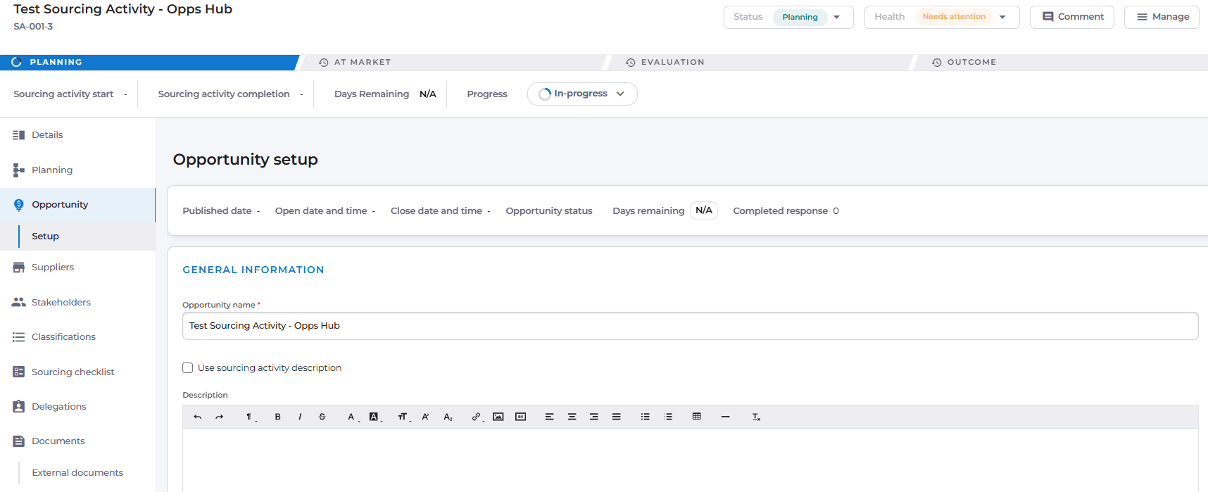 This tab allows the user to set up the details for the opportunity so that Suppliers can submit a bid.