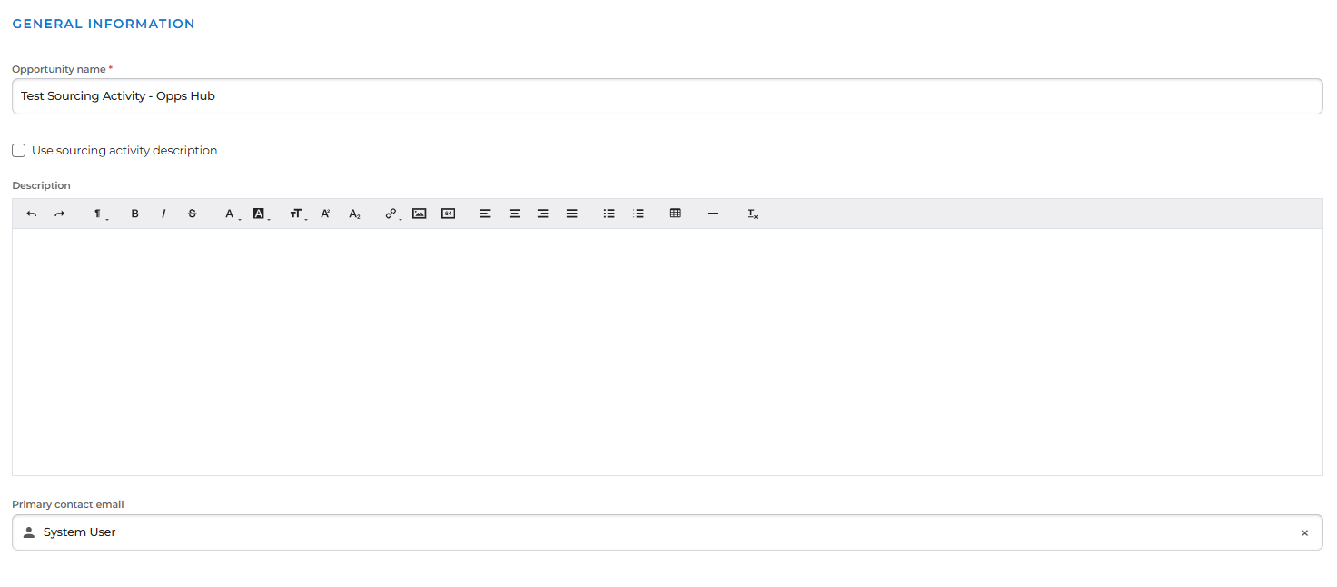 The General information section includes a field for entering a description. There is an option to use the description from the Sourcing Activity. This text will be visible to suppliers.