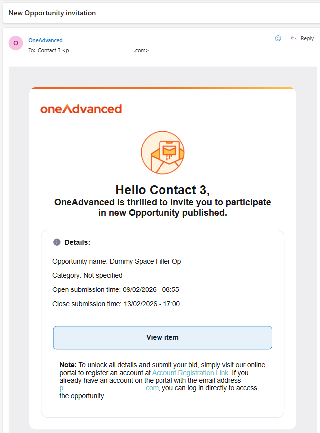 Once the opportunity is published, the contacts selected will receive an email notification inviting them to take part: