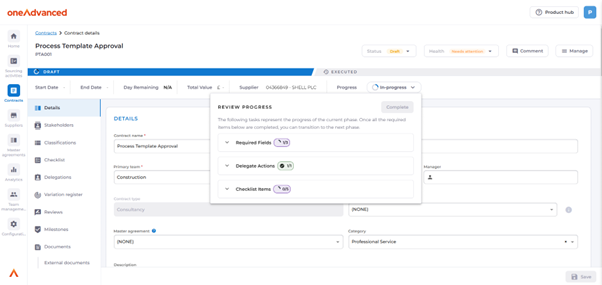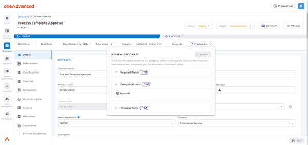 The Progress dropdown will indicate whether approval is required to advance through the contract stages.