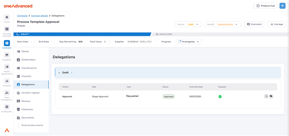 The approver will review the request to ensure all the necessary actions have been taken to progress the contract's stage and then will either accept the request, or reject it and leave comments as to why.