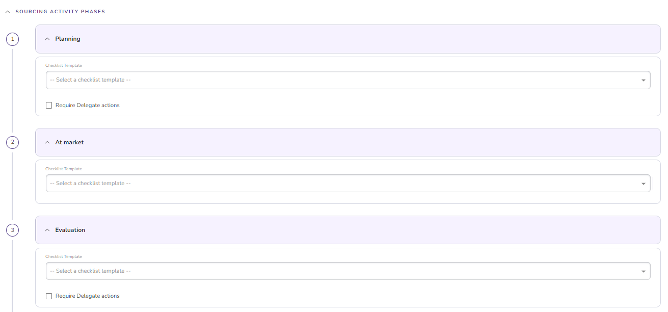 Sourcing Activity Process templates can now have a flag to require a delegate action template to be completed before the evaluation can be finalised. This template will appear at the bottom of the evaluation page and will lock evaluation outcomes once in progress and completed.