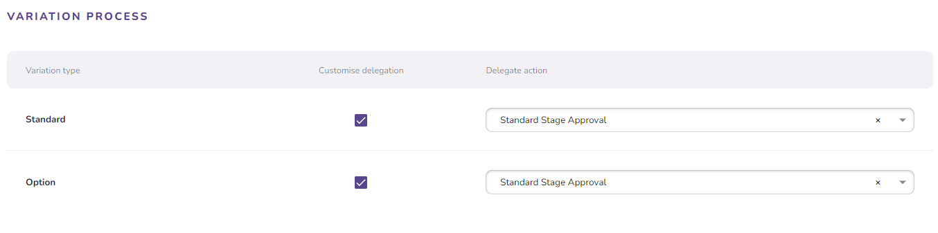 This feature allows system admins to define delegate approval flows for contract variations, on a contract type by contract type basis. When a contract user creates a new variation, the appropriate Delegate Action Template will be added to the variation. The user must seek and receive the required delegate actions before they can apply the variation to the contract.
