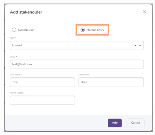 Users can now add internal stakeholders with manually added details, rather than only being able to source from users already setup within the solution.