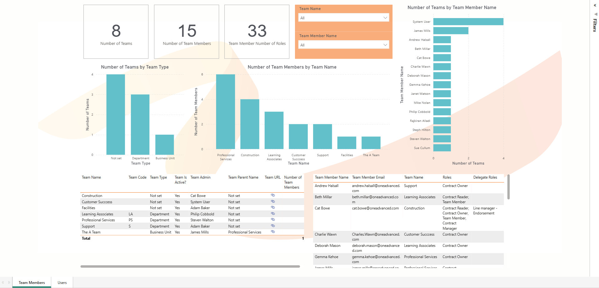 This dashboard provides insights into the teams configured within the system, including their composition, as well as the users that have been granted access to the site.