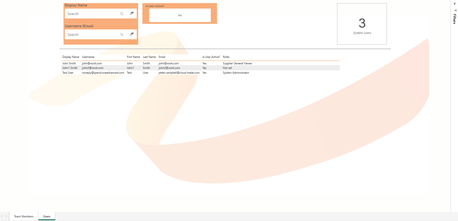 The data presented here allows users to see the roles a person holds, whether they are active or inactive and the general details of their user account. This helps identify each person's roles and permissions across the Supplier module.