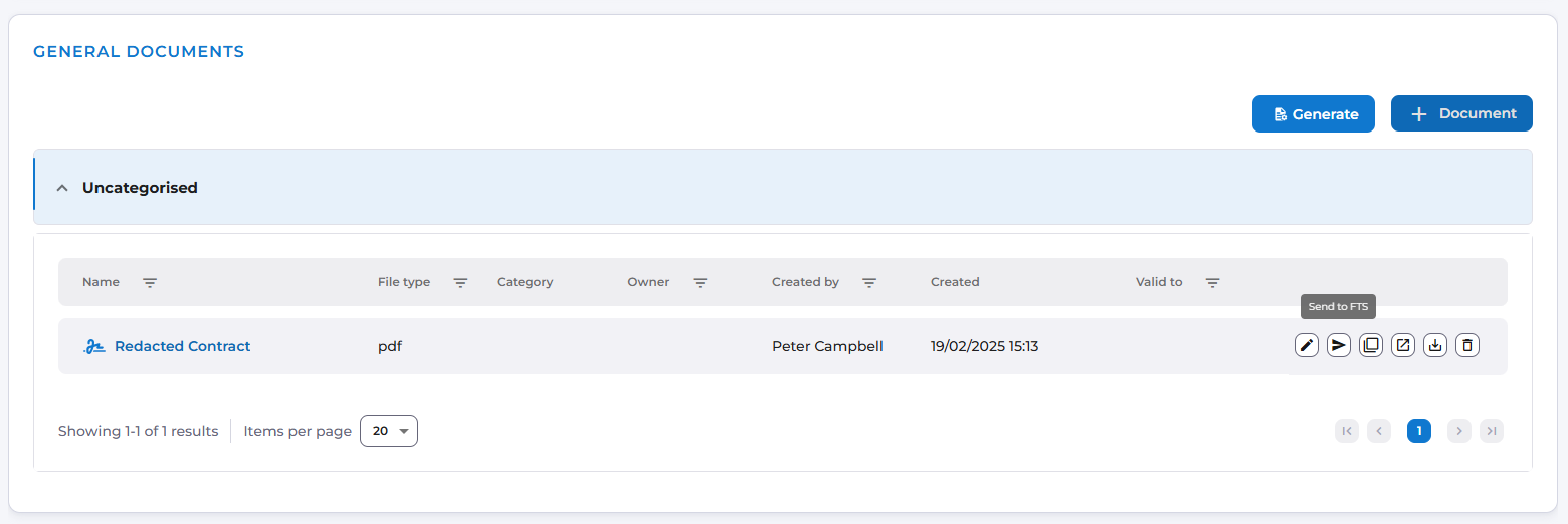 Once the document has been added to the record, additional action buttons will appear, including Send to FTS.