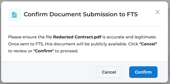 Once selecting this action, you will receive a prompt to confirm you are happy to publish this document to FTS and to inform you that this action cannot be undone, once completed.
