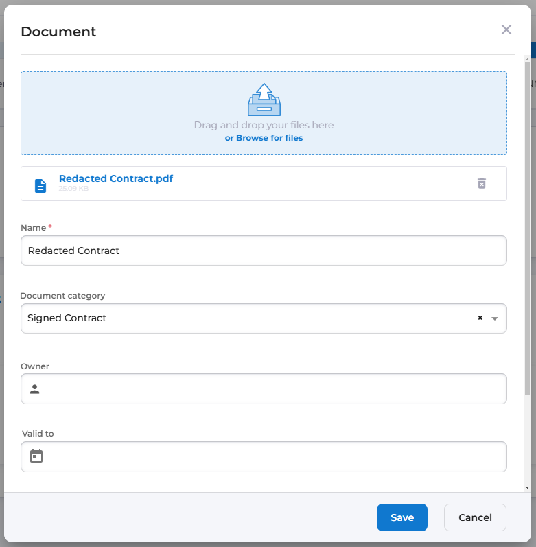 If multiple document types can be uploaded, the type for the document can be selected from the dropdown list shown.