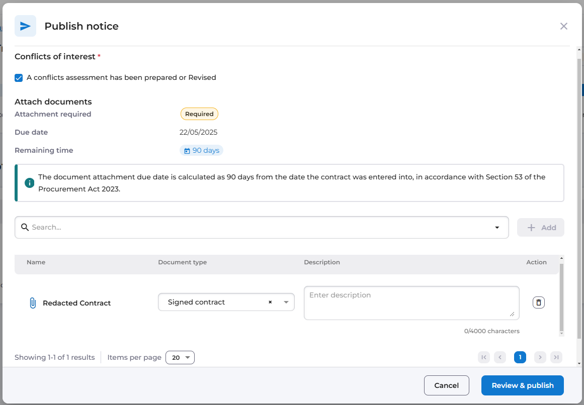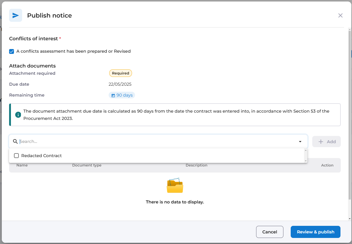 After selecting the document(s), be sure to click the + Add button to attach it to the notice.